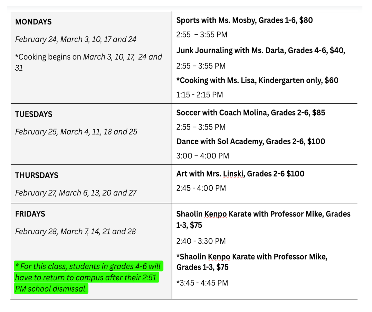 Register and pay with the printed registration form (past Class Descriptions) and return it (along with a check made payable to Valley View Parents Club and the signed waivers) to the white ASEP box in the front office.
