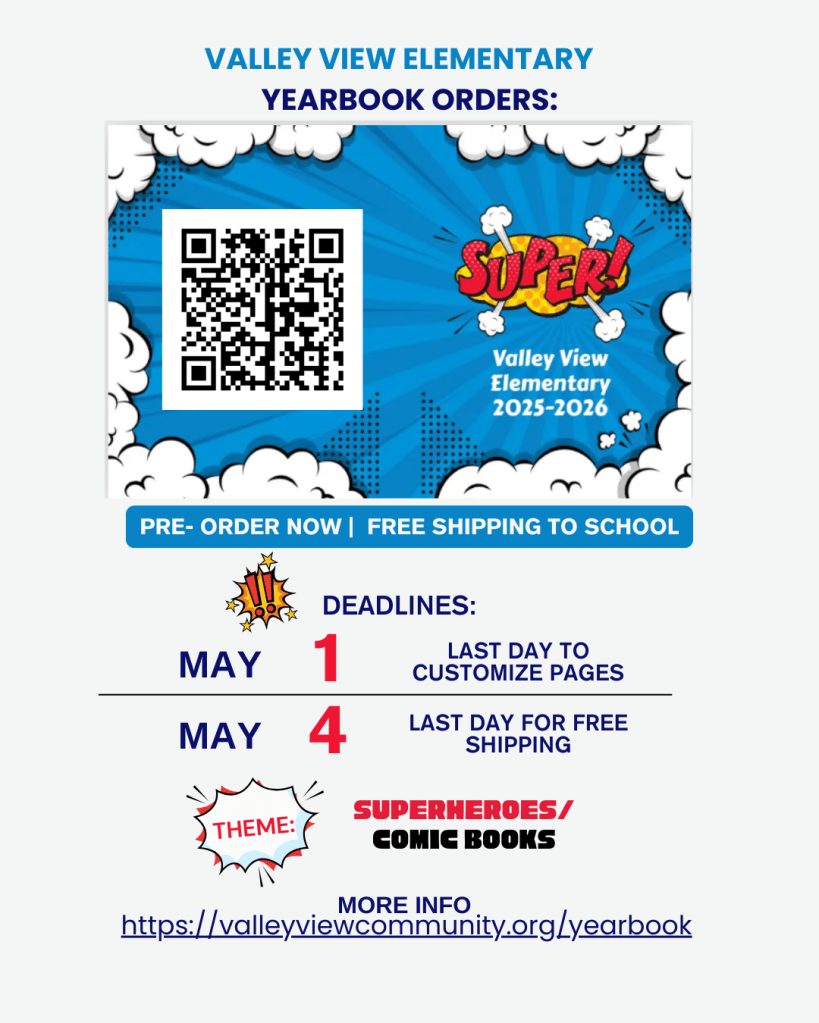 - All pre-orders will be shipped to the school at the end of May 2026. The VVPC will distribute yearbooks to classrooms, and students will bring them home.